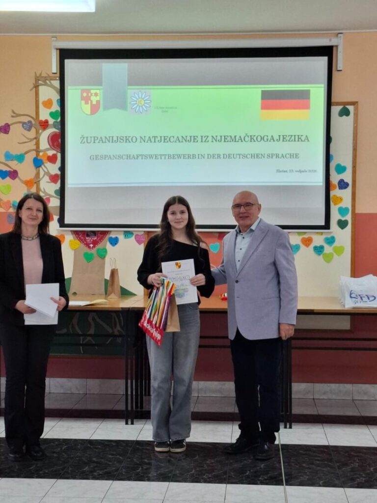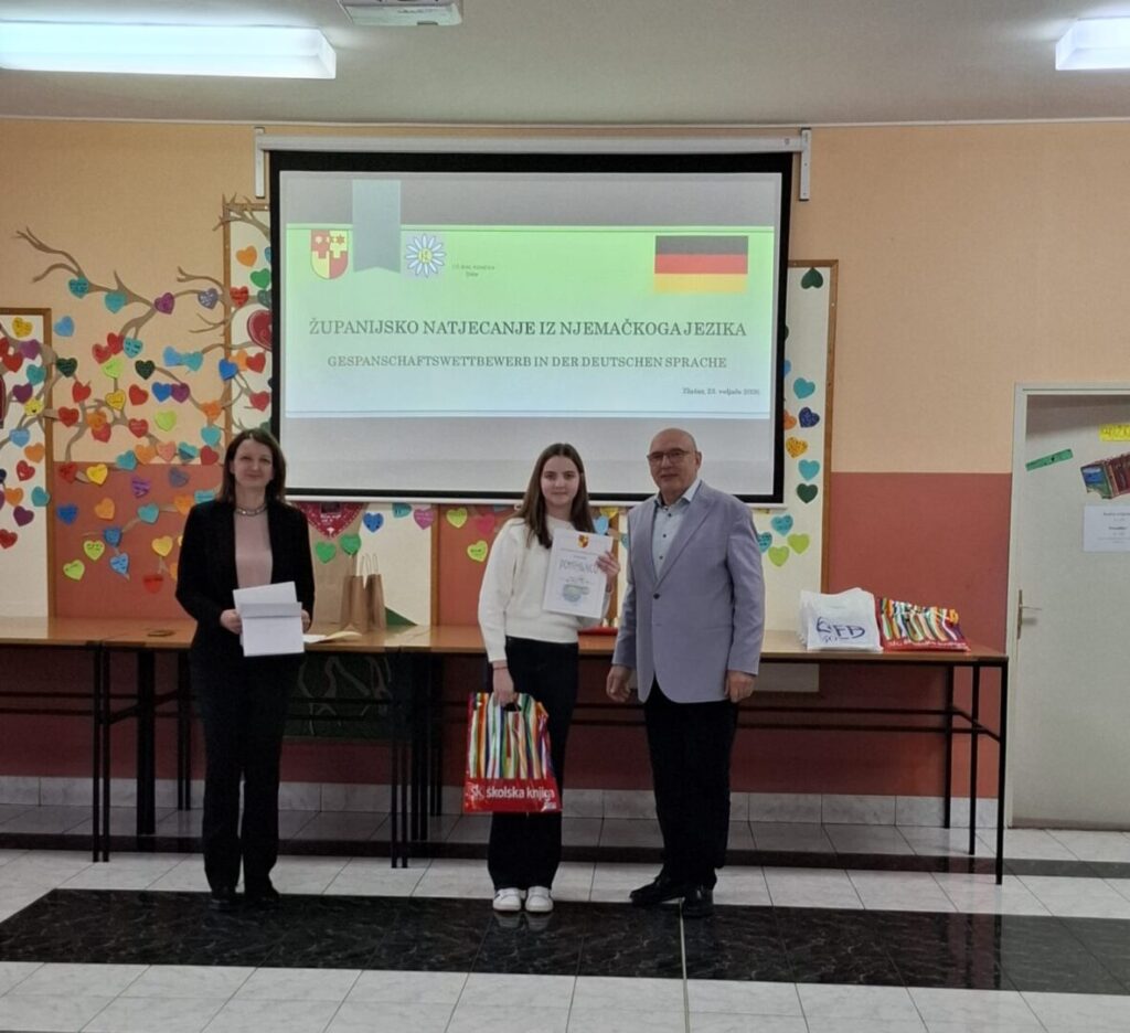 U Osnovnoj školi Ante Kovačića u Zlataru održano je Županijsko natjecanje iz njemačkog jezika koje se provodi među učenicima osmih razreda u kategorijama prvog i drugog stranog jezika. Među najboljima u županiji i ove su se godine istaknule učenice naše škole. Na natjecanju su sudjelovale učenice 8. razreda, Klara Kralj i Petra Petek, koje su ostvarile izniman uspjeh. Klara je osvojila drugo mjesto, a Petra treće. Čestitamo na sjajnom rezultatu, trudu i znanju te im želimo puno uspjeha dalje! Čestitamo i mentorici, učiteljici njemačkog jezika Sanji Kolman Čukac koja je svojim predanim radom i trudom doprinijela uspjehu svojih učenica.